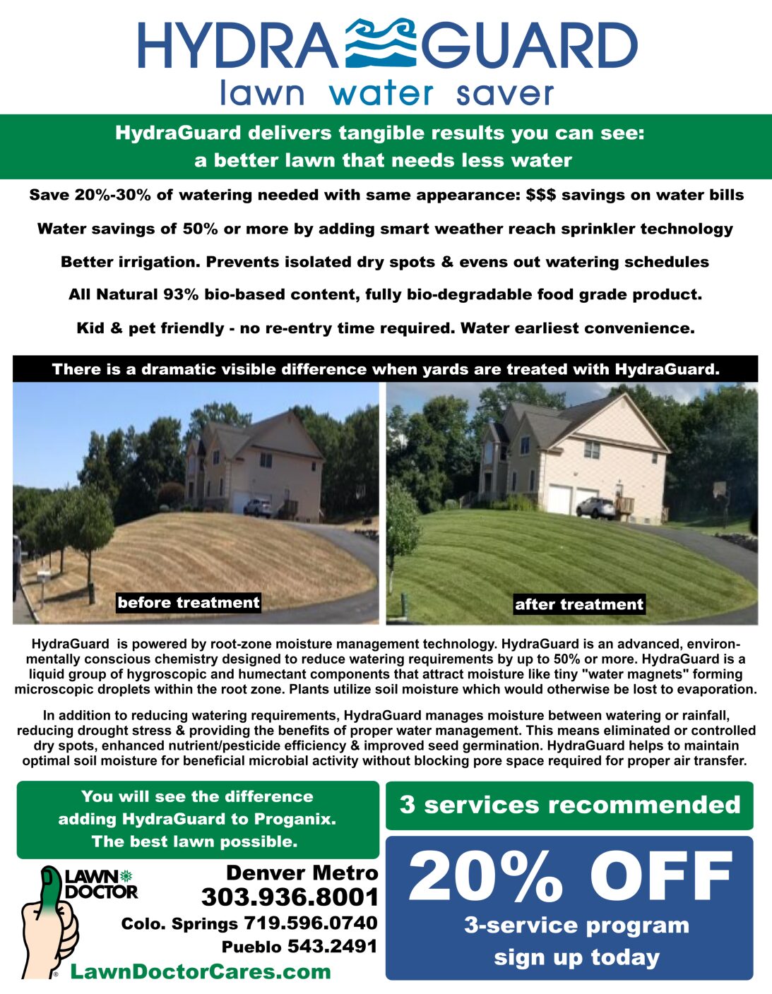 With municipalities enacting watering restrictions and the national increase in water prices, keeping an efficient watering schedule for your lawn has never been more important. With Lawn Doctor’s Hydra Guard service, you won’t have to worry about either. Our professional grass treatment extends the time between required watering so that your Fountain lawn can stay healthy while conforming to local watering restrictions. Keep your entire lawn green, reduce your water usage by up to 30 percent, and be the envy of Fountain with Lawn Doctor’s Hydra Guard service.
